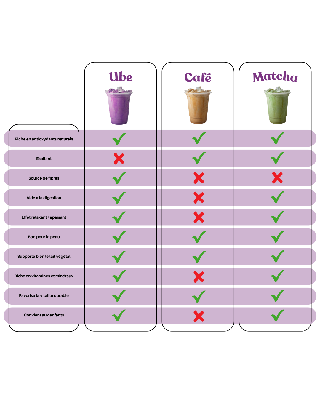 Chaque boisson a son caractère : le café réveille intensément, le matcha apaise tout en dynamisant, et l’ube séduit par sa douceur naturelle et ses bienfaits antioxydants.